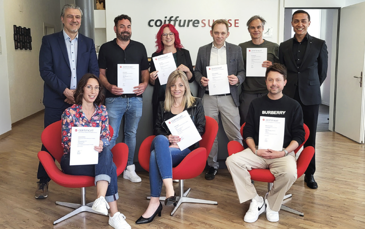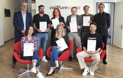 Am 20.04.2026 fand bei Coiffure Suisse in Bern eine Schulung für Sektionspräsident/innen statt. Mit dabei waren (h. l. - v. r.) Damien Ojetti, Zentralpräsident; Ramon Grimm, Aargau; Ruth Fellino, Basel-Land; David von Graffenried, Bern und Umgebung; Reto Bernasconi, Glarus; Antonio Primiceri, Berater Region Deutschschweiz; Marlène Wiedmer, Genève; Catia Pasquier, Fribourg, und Martin Mühlematter, Berner Oberland.