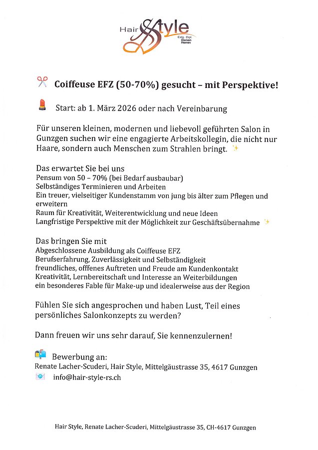 Wir suchen eine Coiffeuse EFZ mit Berufserfahrung, das Pensum ist bei Bedarf ausbaubar. Es besteht die Aussicht auf Geschäftsübernahme