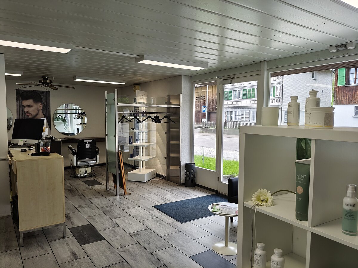 Der 100 m2 grosse Raum besteht aus einem Verkaufsraum mit Garderobe und Kaffeeecke, einem Herren- und Damensalon und einer Toilette. Ferner befindet sich im Treppenhaus ein Lager. Im hinteren Teil befinden sich das Lavabo sowie eine Waschmaschine und ein Tumbler. Parkplätze sind vorhanden.