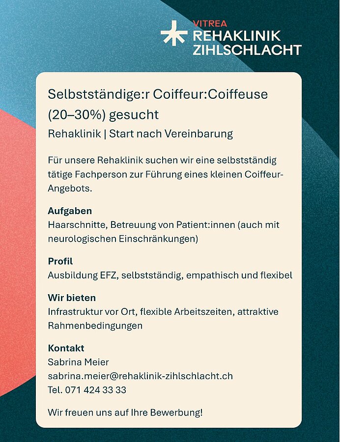 Für unsere moderne neurologische Rehaklinik suchen wir per 01.06.2026 eine engagierte, selbstständig tätige:n Coiffeur:Coiffeuse im Umfang von 30–40%, die:der unseren Patient:innen einen professionellen und zugleich einfühlsamen Service bietet.